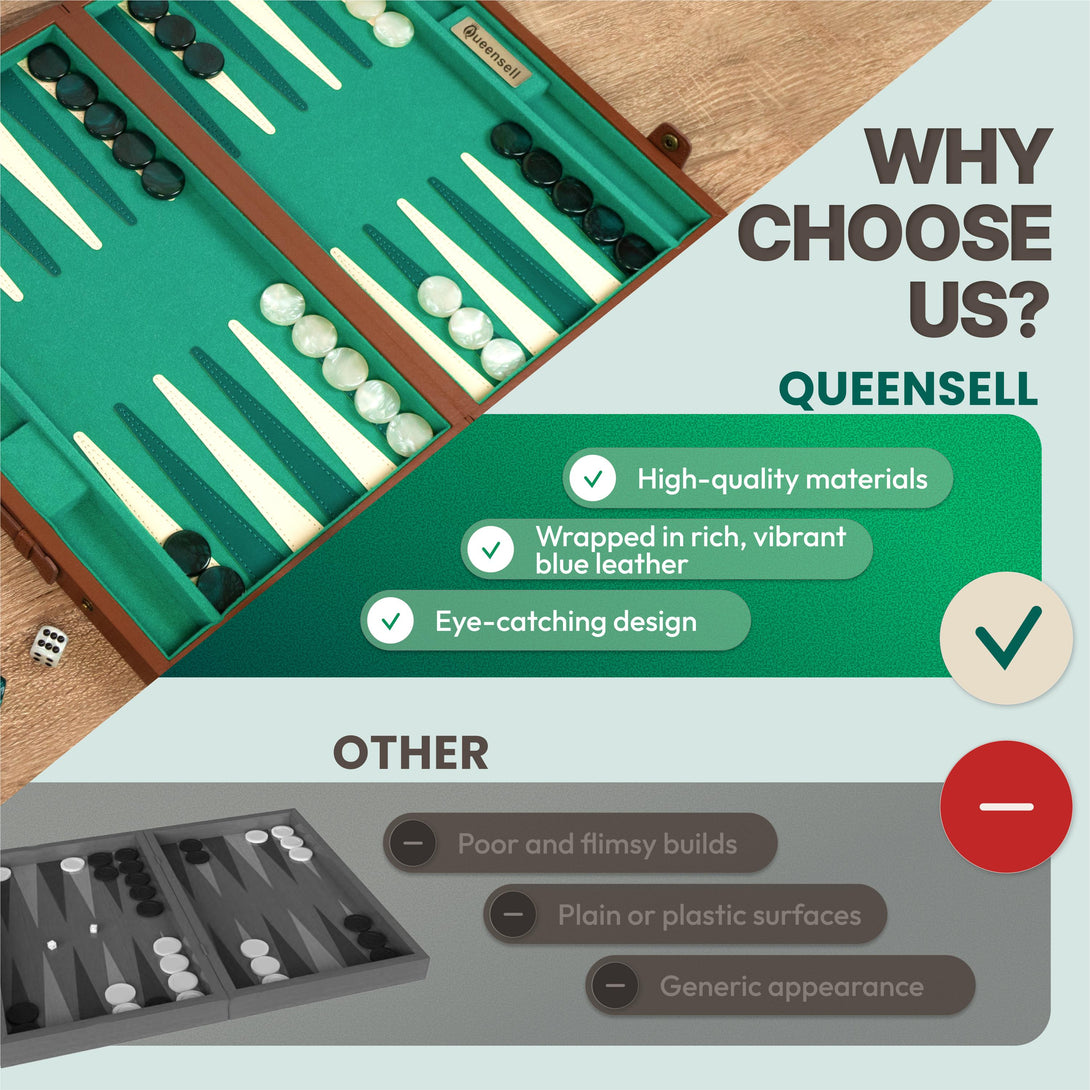 - Premium Quality Craftsmanship - made from durable wood and wrapped in elegant PU leather, this Backgammon Game Set features a smooth felt playing field with clear leatherette points for a classic, high-end look and superior gameplay experience.