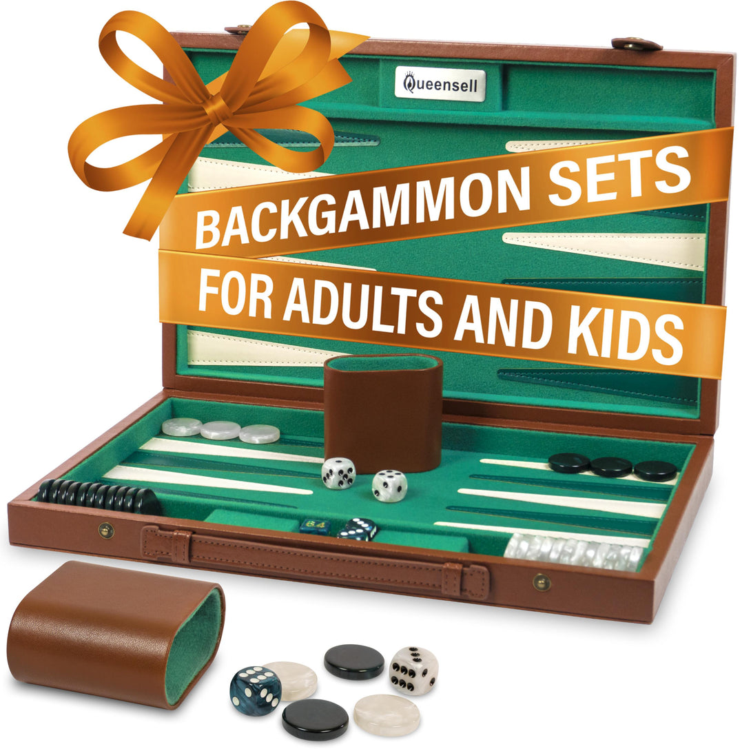 - Complete Backgammon Set - experience one of the world’s oldest strategy games in premium style. This Large Backgammon Set for Adults includes a 21-inch Backgammon Board, 32 Wooden Playing Chips, 4 Precision Dice, 1 Doubling Cube, 2 Dice Cups, and full-color instructions.